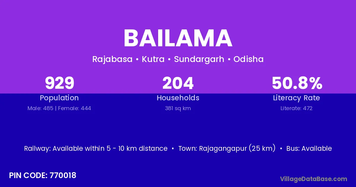 Rajagangapur (25 km) is the nearest town to Bailama village for major economic activities and is located approximately 25 km away.