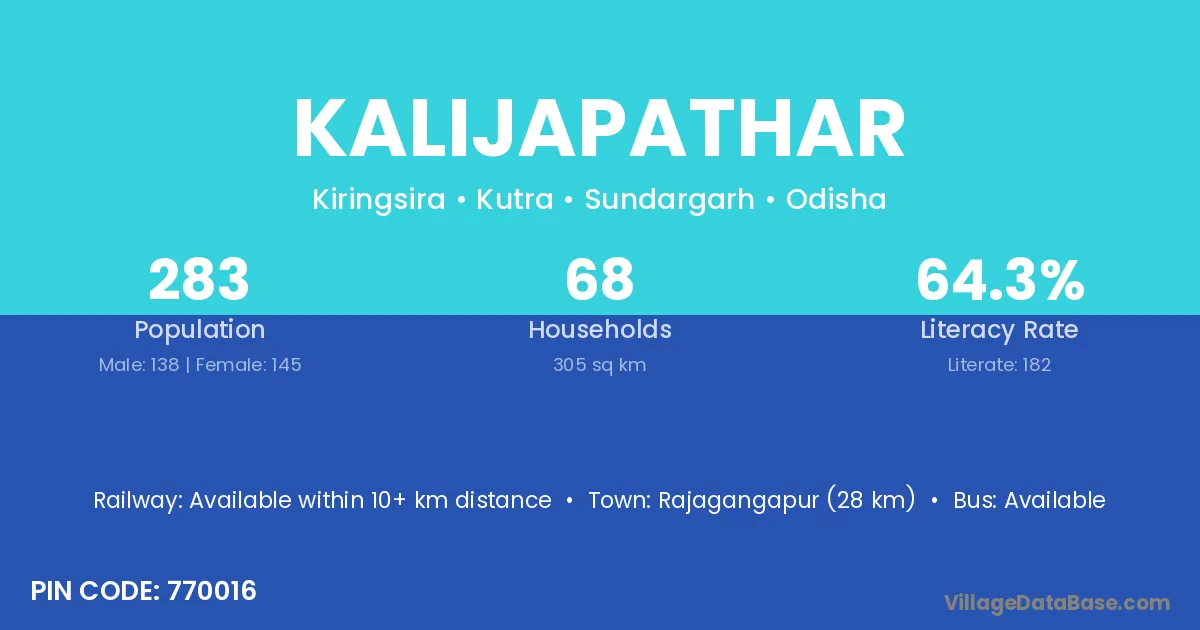 Rajagangapur (28 km) is the nearest town to Kalijapathar village for major economic activities and is located approximately 28 km away.