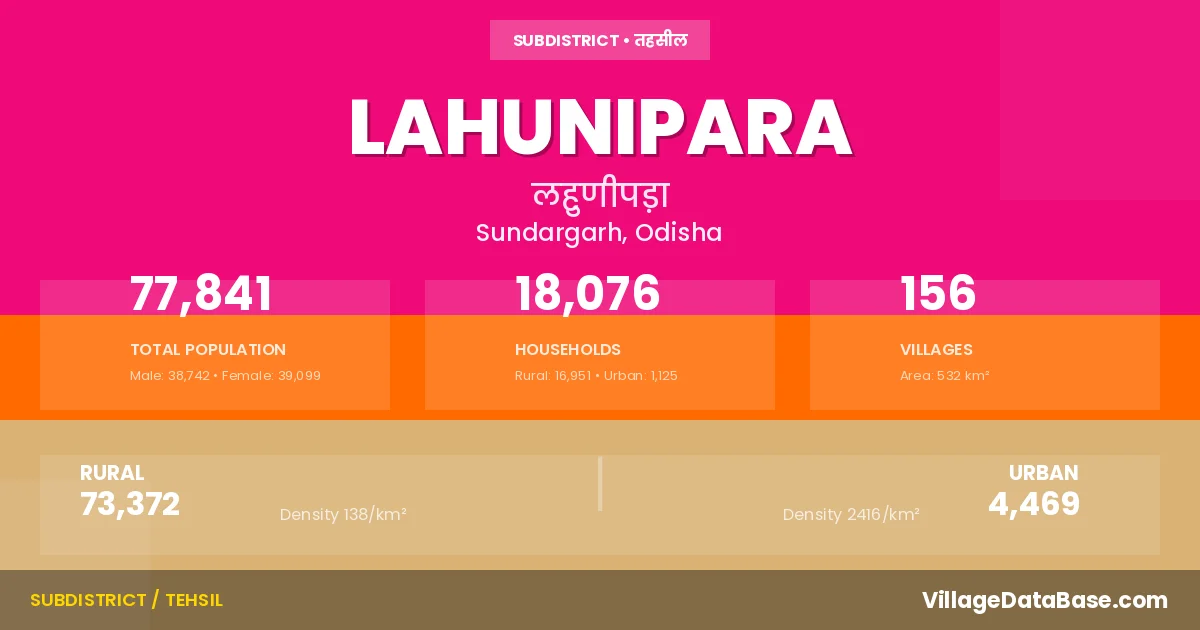According to the 2011 census The total area of Lahunipara Tehsil is 532 km², with a population of 77841 people. The population density is 146 inhabitants per square kilometre, and there are approximately 18076 houses in the sub district.