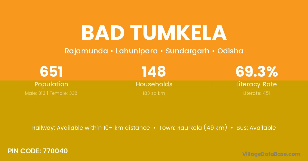 Bad Tumkela village has a total population of 651 people, of which 313 are males and 338 are females.