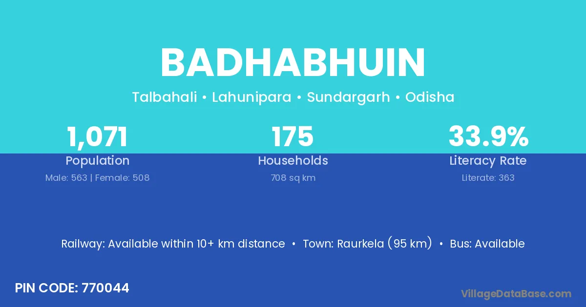 Raurkela (95 km) is the nearest town to Badhabhuin village for major economic activities and is located approximately 95 km away.