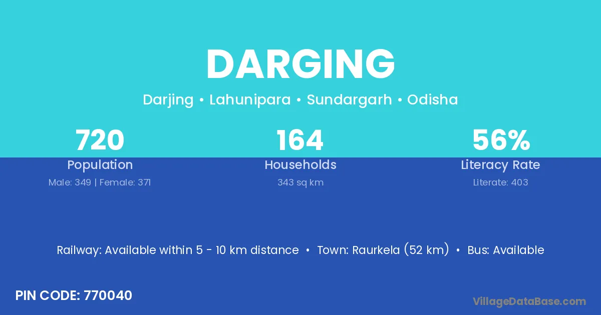 Raurkela (52 km) is the nearest town to Darging village for major economic activities and is located approximately 52 km away.