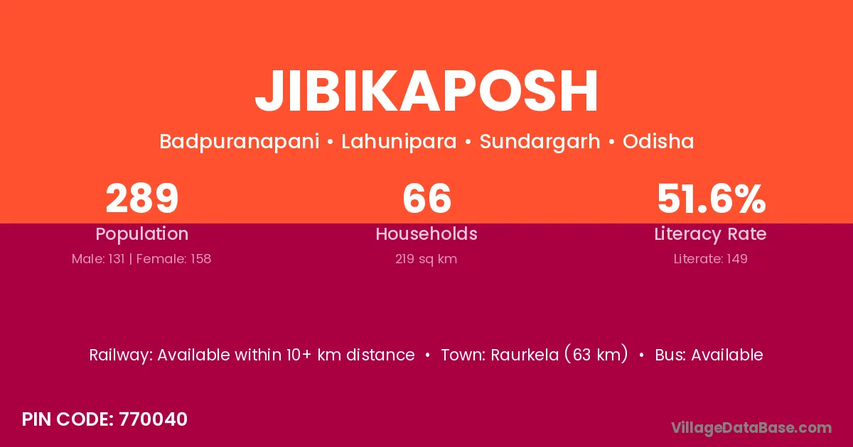 Raurkela (63 km) is the nearest town to Jibikaposh village for major economic activities and is located approximately 63 km away.