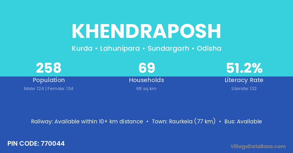 Raurkela (77 km) is the nearest town to Khendraposh village for major economic activities and is located approximately 77 km away.