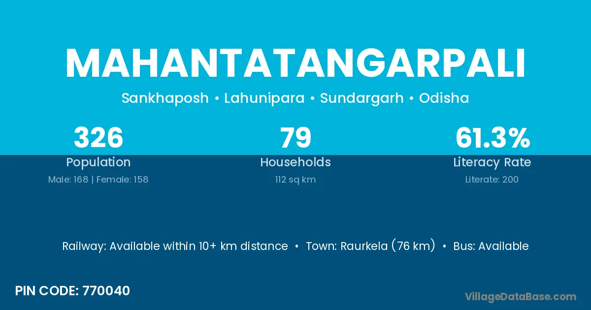 Mahantatangarpali village has a total population of 326 people, of which 168 are males and 158 are females.