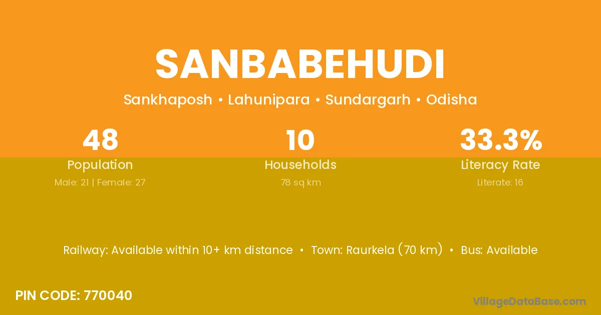 Raurkela (70 km) is the nearest town to Sanbabehudi village for major economic activities and is located approximately 70 km away.