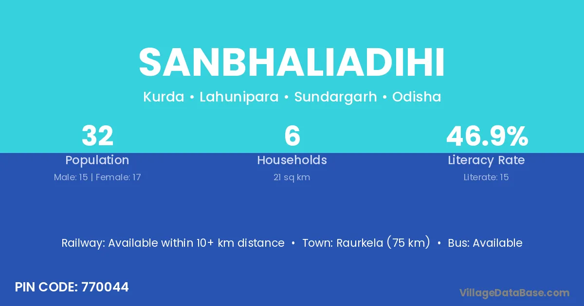 Sanbhaliadihi village has a total population of 32 people, of which 15 are males and 17 are females.