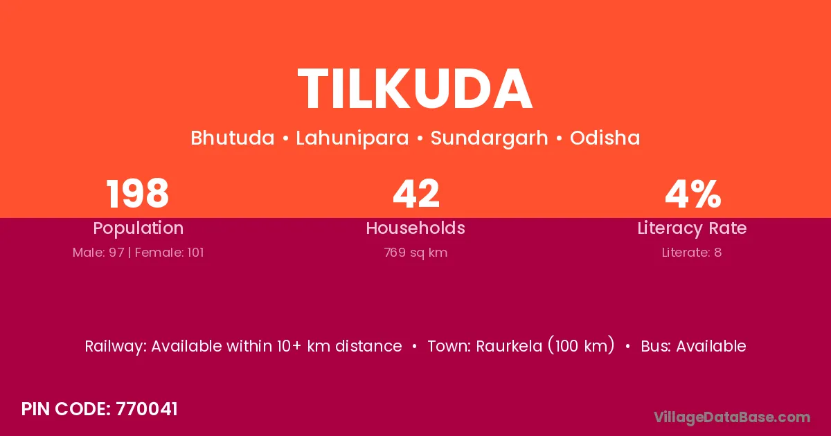 Tilkuda village has a total population of 198 people, of which 97 are males and 101 are females.