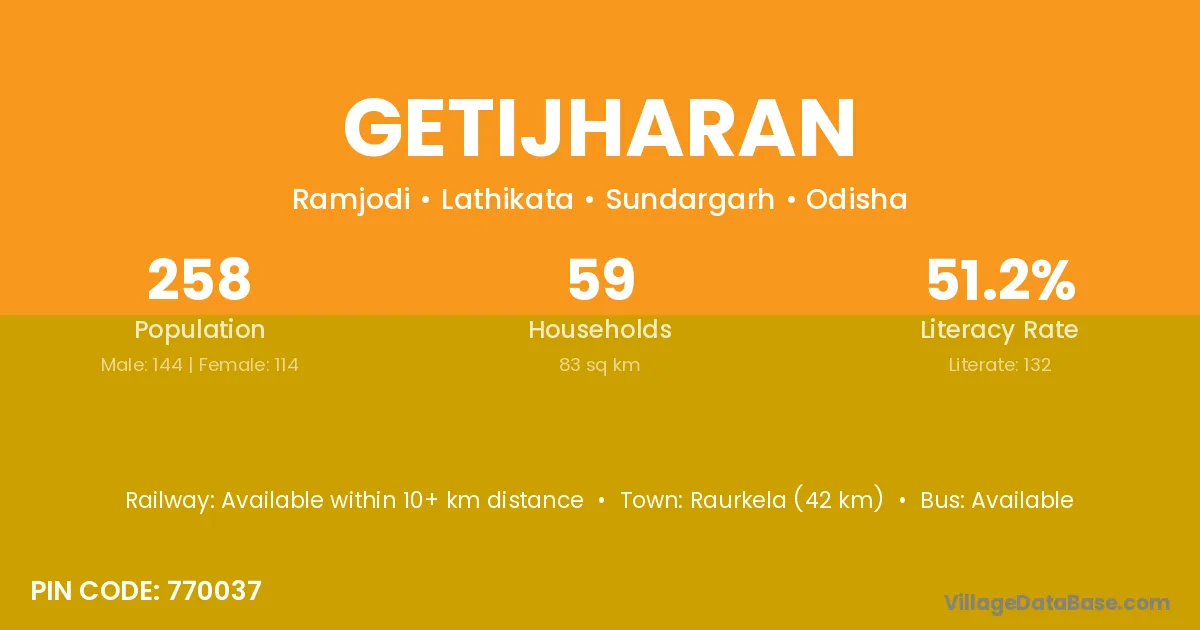 Raurkela (42 km) is the nearest town to Getijharan village for major economic activities and is located approximately 42 km away.