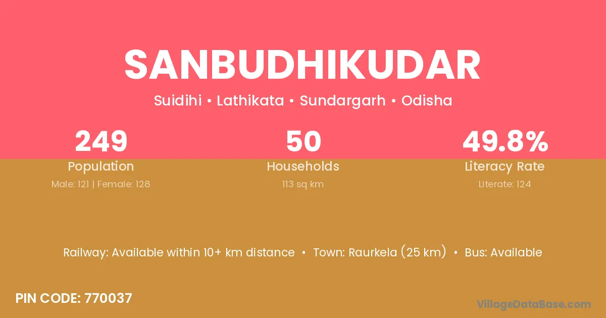 Sanbudhikudar village has a total population of 249 people, of which 121 are males and 128 are females.