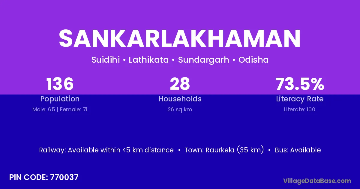 Raurkela (35 km) is the nearest town to Sankarlakhaman village for major economic activities and is located approximately 35 km away.