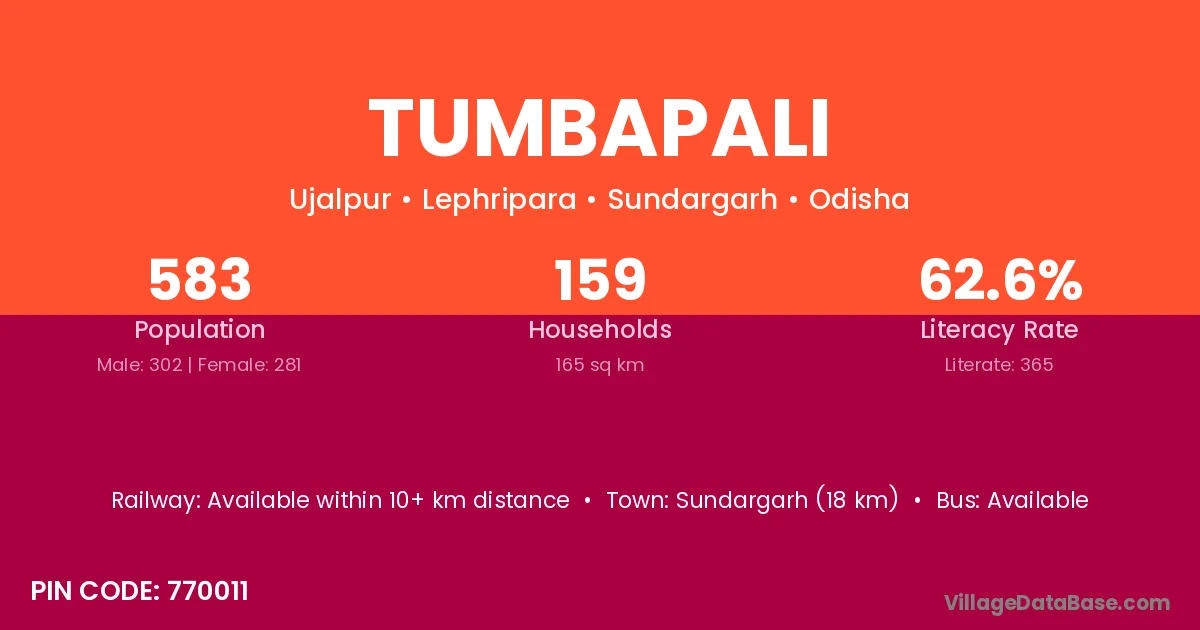 Tumbapali village has a total population of 583 people, of which 302 are males and 281 are females.