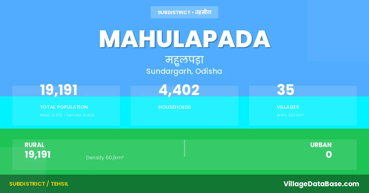 According to the 2011 census The total area of Mahulapada Tehsil is 322 km², with a population of 19191 people. The population density is 60 inhabitants per square kilometre, and there are approximately 4402 houses in the sub district.