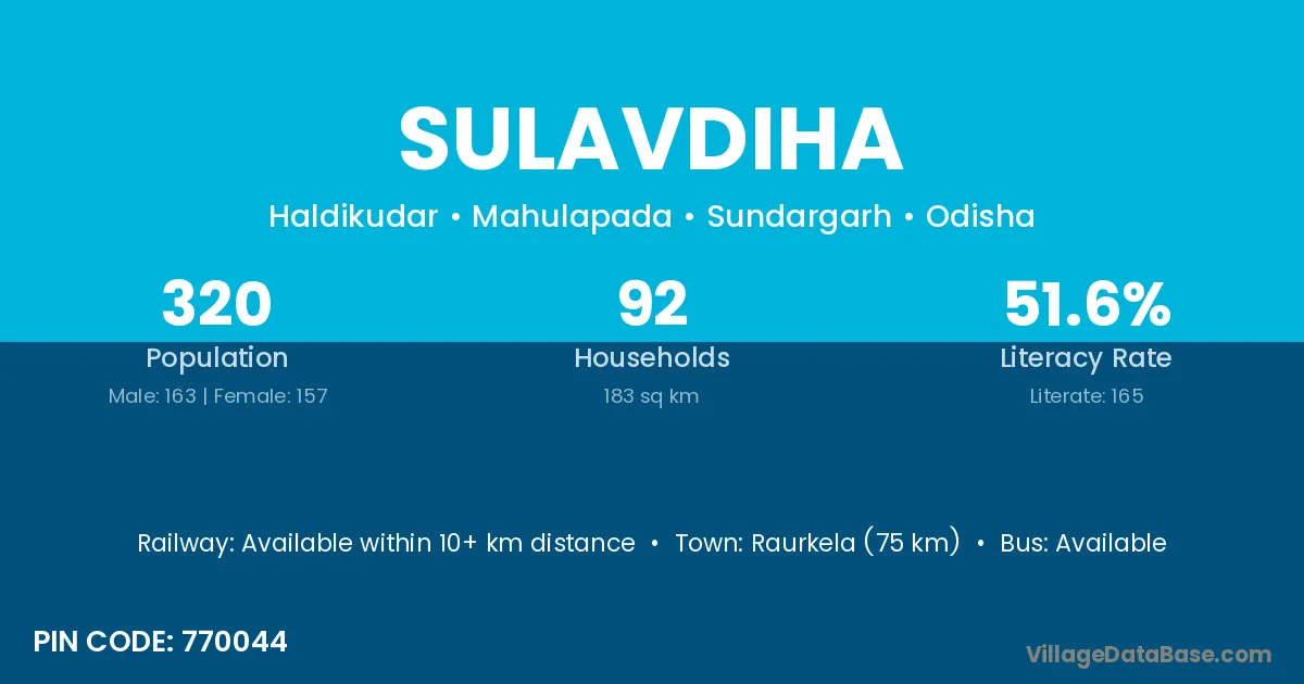 Raurkela (75 km) is the nearest town to Sulavdiha village for major economic activities and is located approximately 75 km away.