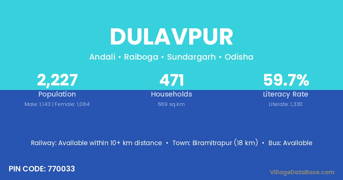 Biramitrapur (18 km) is the nearest town to Dulavpur village for major economic activities and is located approximately 18 km away.