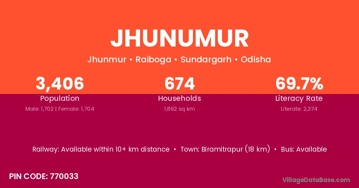 Biramitrapur (18 km) is the nearest town to Jhunumur village for major economic activities and is located approximately 18 km away.