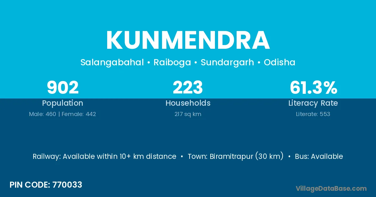 Biramitrapur (30 km) is the nearest town to Kunmendra village for major economic activities and is located approximately 30 km away.