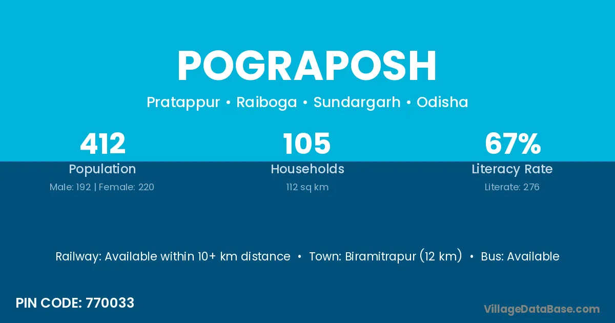 Biramitrapur (12 km) is the nearest town to Pograposh village for major economic activities and is located approximately 12 km away.