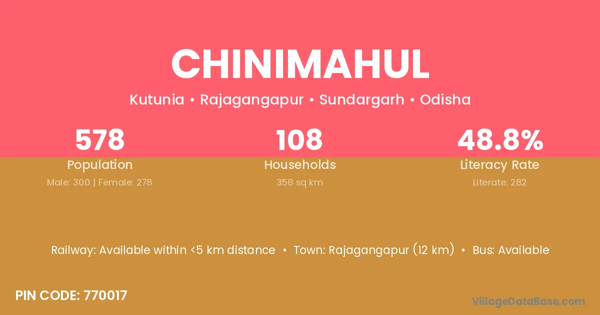Rajagangapur (12 km) is the nearest town to Chinimahul village for major economic activities and is located approximately 12 km away.