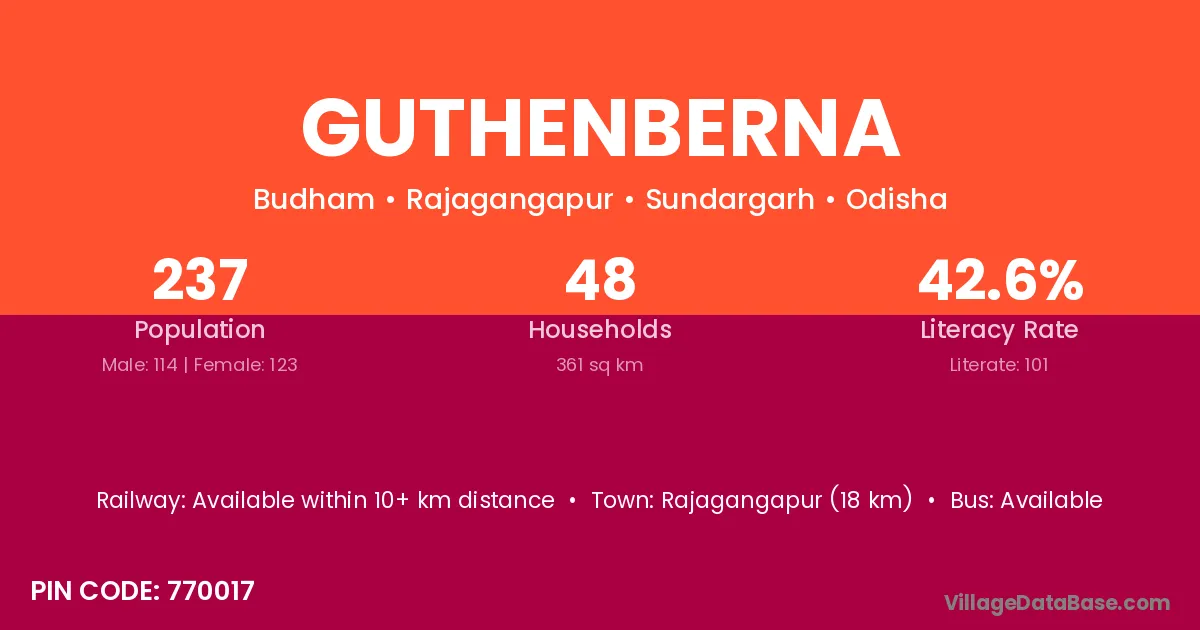 Rajagangapur (18 km) is the nearest town to Guthenberna village for major economic activities and is located approximately 18 km away.