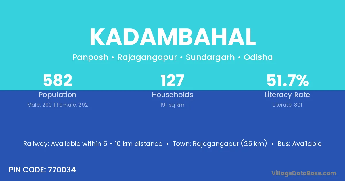 Rajagangapur (25 km) is the nearest town to Kadambahal village for major economic activities and is located approximately 25 km away.