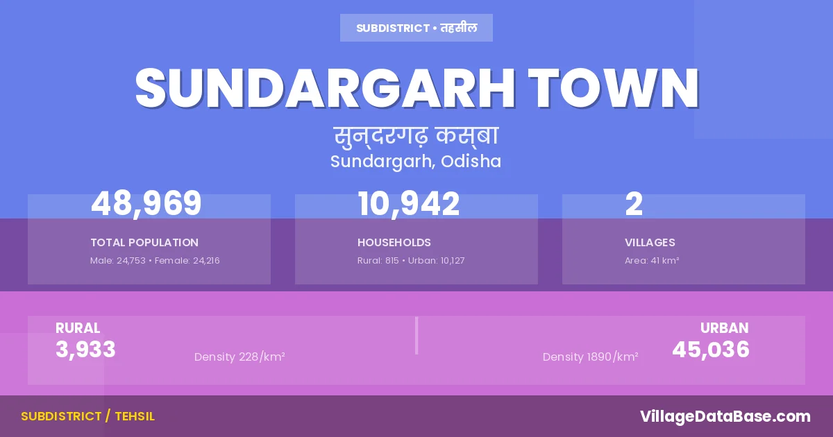 According to the 2011 census The total area of Sundargarh Town Tehsil is 41 km², with a population of 48969 people. The population density is 1,192 inhabitants per square kilometre, and there are approximately 10942 houses in the sub district.
