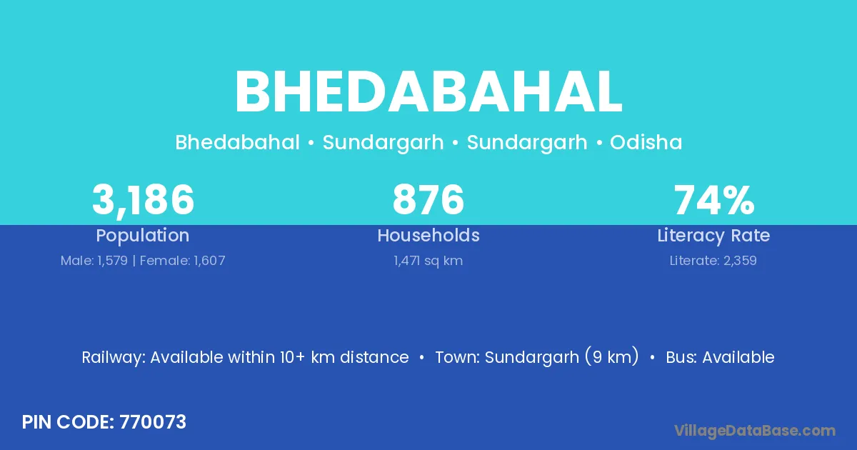 Sundargarh (9 km) is the nearest town to Bhedabahal village for major economic activities and is located approximately 9 km away.