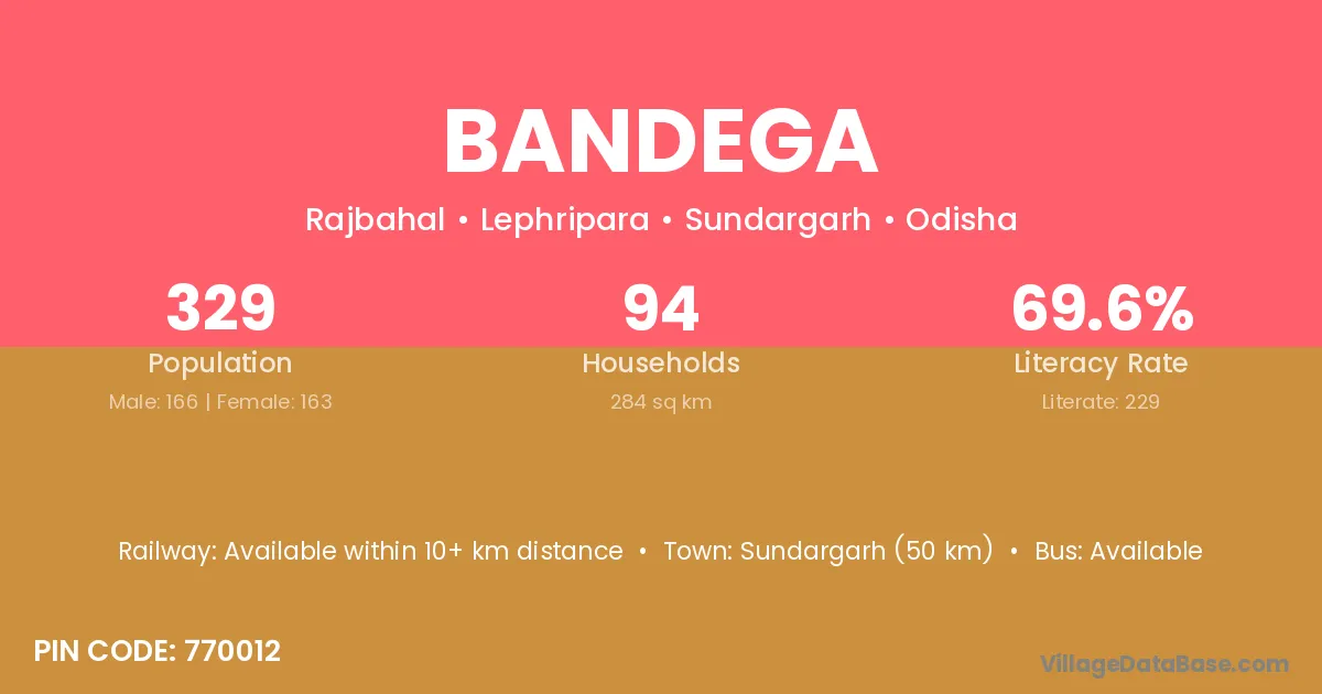 Sundargarh (60 km) is the nearest town to Bandega village for major economic activities and is located approximately 60 km away.