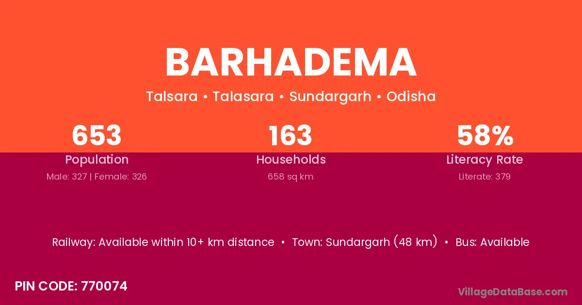 Sundargarh (48 km) is the nearest town to Barhadema village for major economic activities and is located approximately 48 km away.