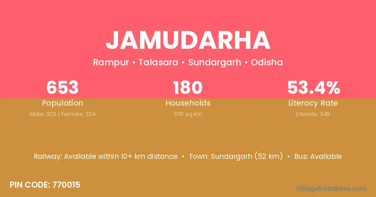 Sundargarh (52 km) is the nearest town to Jamudarha village for major economic activities and is located approximately 52 km away.
