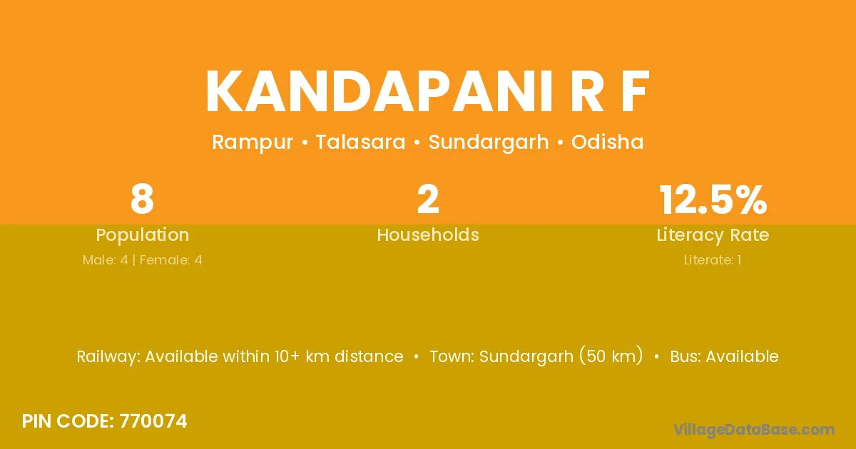 Sundargarh (50 km) is the nearest town to Kandapani R F village for major economic activities and is located approximately 50 km away.