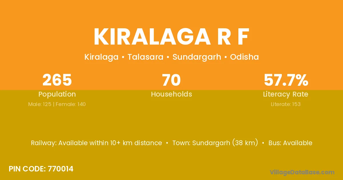 Sundargarh (38 km) is the nearest town to Kiralaga R F village for major economic activities and is located approximately 38 km away.