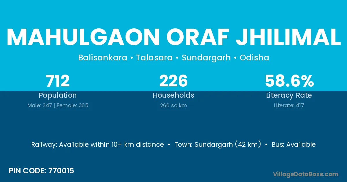 Sundargarh (42 km) is the nearest town to Mahulgaon Oraf Jhilimal village for major economic activities and is located approximately 42 km away.