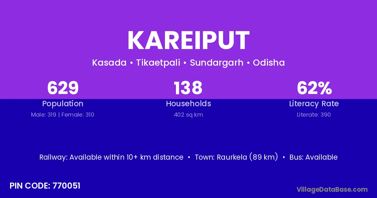 Kareiput village has a total population of 629 people, of which 319 are males and 310 are females.
