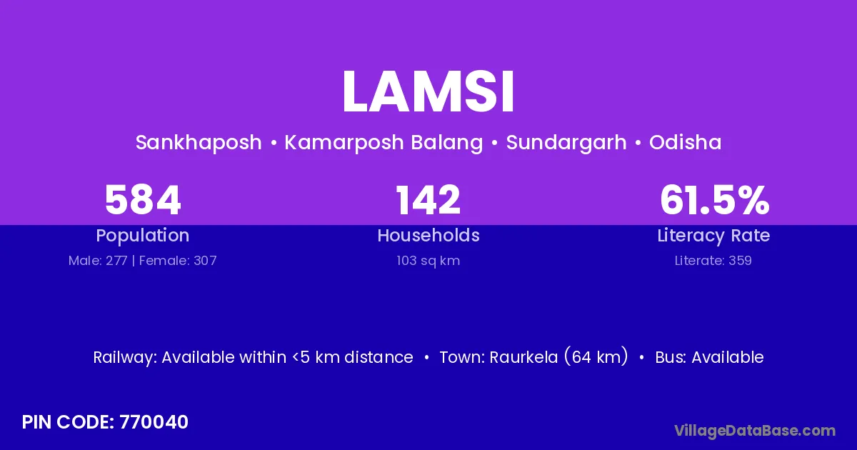 Raurkela (105 km) is the nearest town to Lamsi village for major economic activities and is located approximately 105 km away.