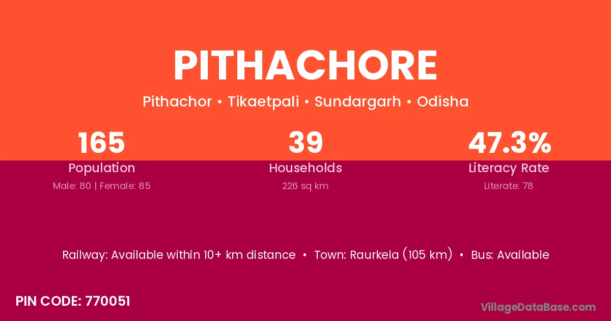 Raurkela (105 km) is the nearest town to Pithachore village for major economic activities and is located approximately 105 km away.