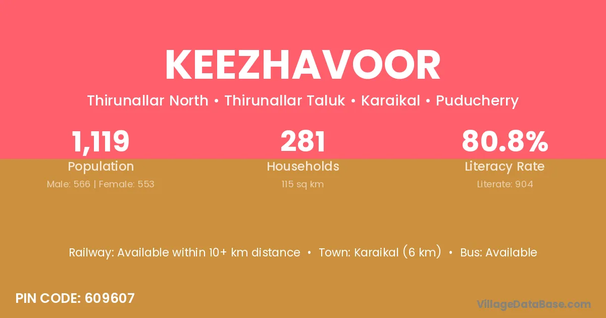 Karaikal (6 km) is the nearest town to Keezhavoor village for major economic activities and is located approximately 6 km away.