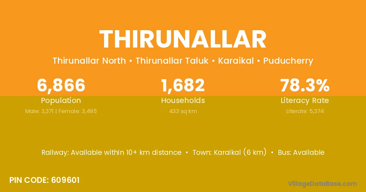 Thirunallar village has a total population of 6,866 people, of which 3,371 are males and 3,495 are females.