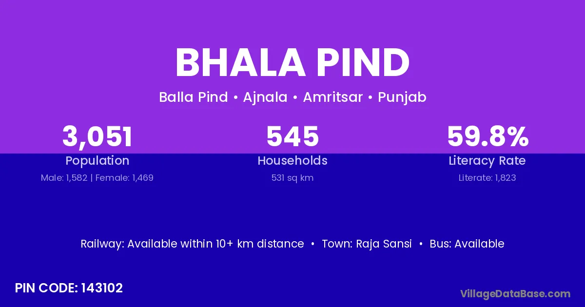 According to Census 2011 information, the village code of Bhala Pind village is 143102.