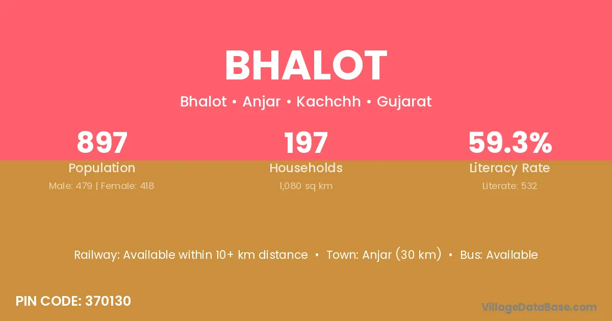 The literacy rate of Bhalot village is 73.77%. Male literacy stands at 78.13% and female literacy at 68.97%.