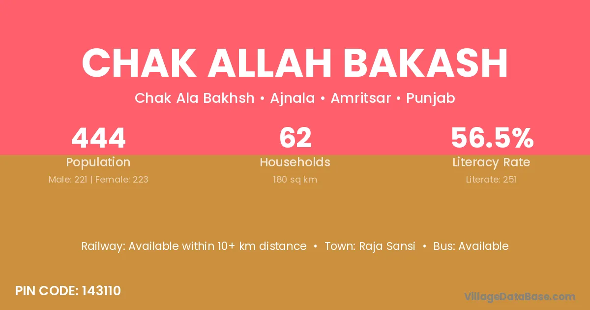 Chak Allah Bakash village has a total population of 444 people, of which 221 are males and 223 are females.