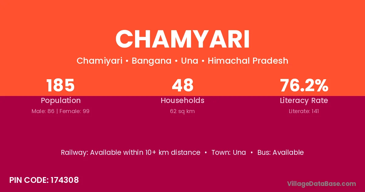 The literacy rate of Chamyari village is 57.54%. Male literacy stands at 61.91% and female literacy at 52.74%.