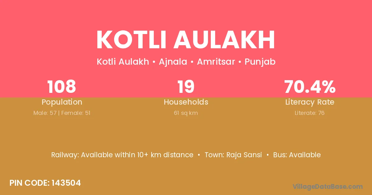 Kotli Aulakh village has a total population of 108 people, of which 57 are males and 51 are females.