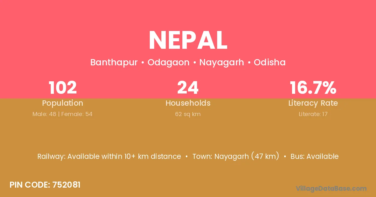 The literacy rate of Nepal village is 53.69%. Male literacy stands at 57.31% and female literacy at 49.54%.