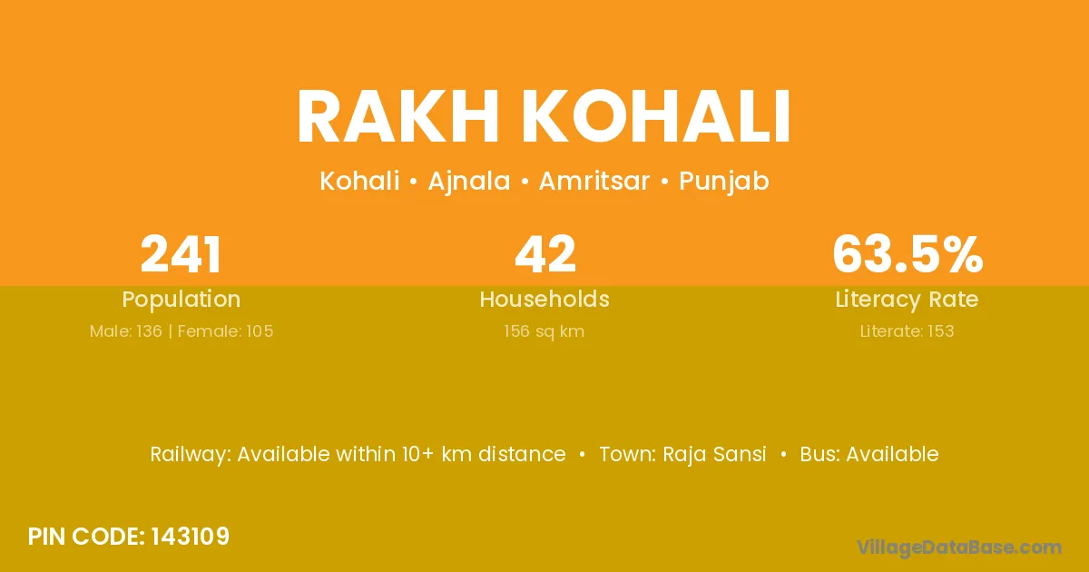Rakh Kohali village has a total population of 241 people, of which 136 are males and 105 are females.