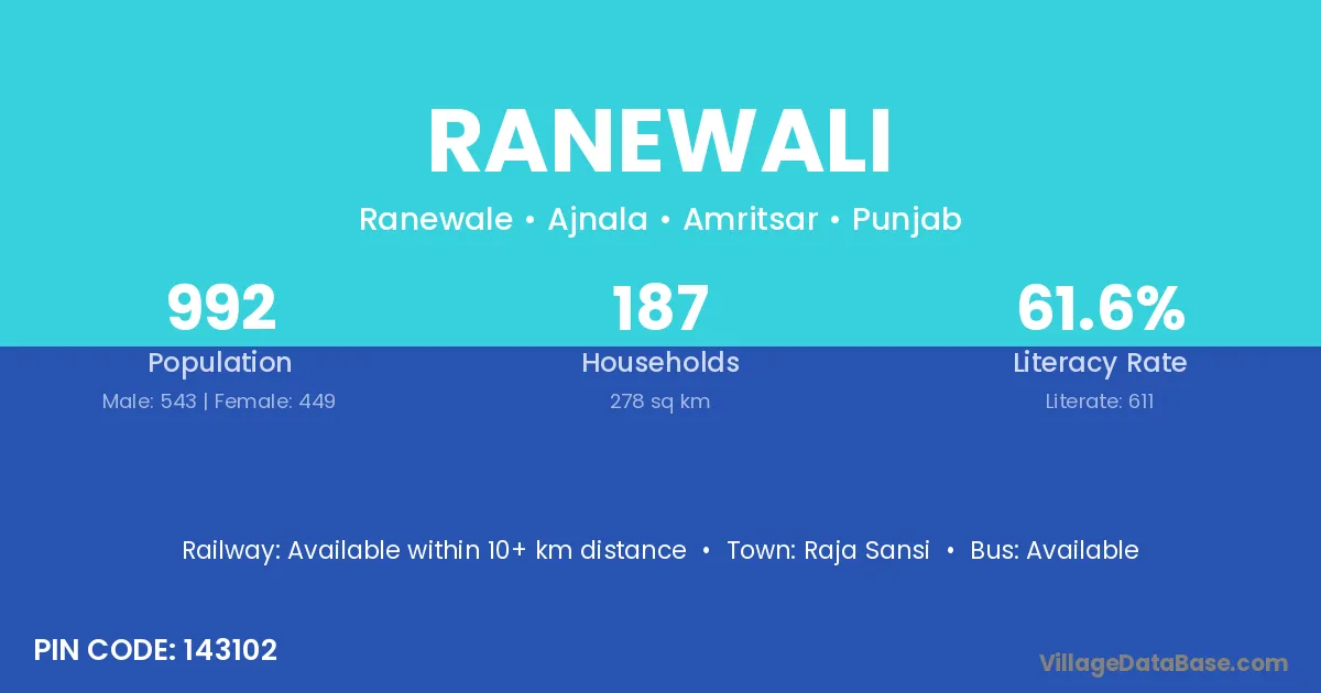 Ranewali village has a total population of 992 people, of which 543 are males and 449 are females.