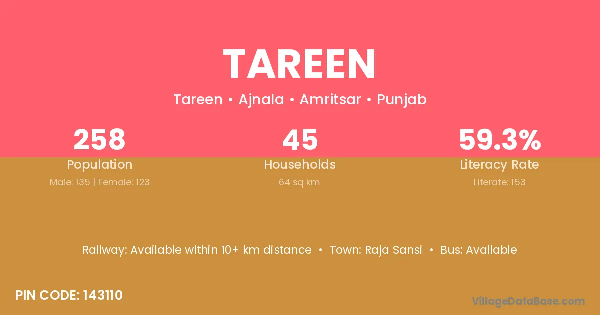 Tareen village has a total population of 258 people, of which 135 are males and 123 are females.