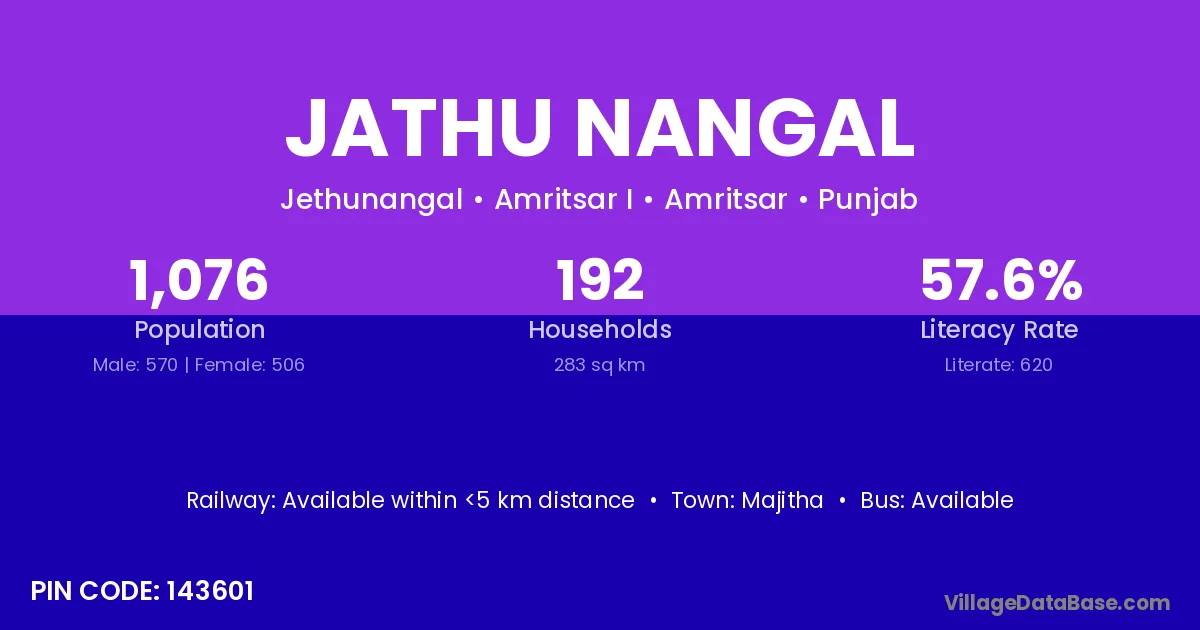 Majitha is the nearest town to Jathu Nangal village for major economic activities
