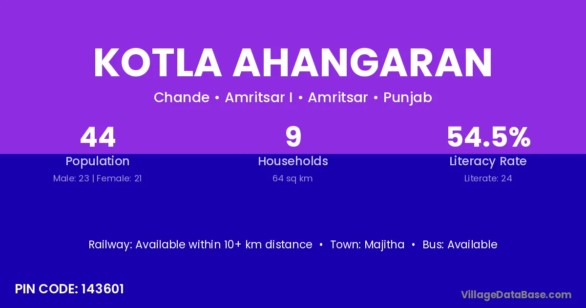 Kotla Ahangaran village has a total population of 44 people, of which 23 are males and 21 are females.