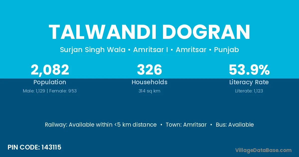 According to Census 2011 information, the village code of Talwandi Dogran village is 143115.
